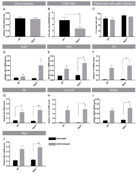In virus-infected cells, cumulative actions of IFNβ1, IFIH1, and DDX58 play a crucial role in mediating early host cellular defense mechanisms [9,10,11,15,40,41,42,43,44] to initiate anti-viral immune responses against infections. Previous studies have shown that CVB3 replicates in mouse islets [45] and that mouse islet cells express coxsackievirus and adenovirus receptor (CAR) which was readily detectable and unchanged between WT and MafA−/− islets (Figure 5A). To evaluate if inherent higher expression of anti-viral response genes also restricted virus propagation, virus titer was assessed in WT and MafA−/− islets infected with CVB3. The amount of newly synthesized virus particles in the culture supernatant was significantly reduced in MafA−/− islets in comparison with CVB3-infected WT islets (Figure 5B). Remarkably, CVB3 infection did not alter cell viability in WT and mutant islets (Figure 3C) supporting the notion that mouse islet cells remained alive after CVB3 infection [46]. This suggested that the differences in CVB3 propagation were not a result of changes in CAR expression or viability of islets (Figure 3A,C) after infection. Expression analysis revealed that the infected MafA−/− islets responded efficiently against CVB3 infection by inducing IFNs (Figure 3D,E) as well as other pro-inflammatory cytokines such as tumor necrosis factor (Tnf), interleukin 6 (Il6), and C-X-C motif chemokine 10 (Cxcl10) (Figure 5F–H), as well as IFN-1 anti-viral genes Mda5 and Rig1 (Figure 5I,J). These data show that MafA−/− islets are more efficient in clearing CVB3 infections than WT islets, most likely due to enhanced basal expression of IFNs and anti-viral genes. Taken together, these results suggest that the loss of MafA in β cells altered the inflammatory microenvironment by producing an inability to restrict Ifnβ1 expression efficiently.