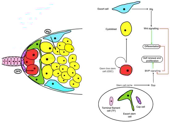 - Yamashita, Y.M.; Fuller, M.T.; Jones, D.L. Signaling in stem cell niches: Lessons from the Drosophila germline. J. Cell Sci. 2005, 118, 665–672. [Google Scholar] [CrossRef] [PubMed]
