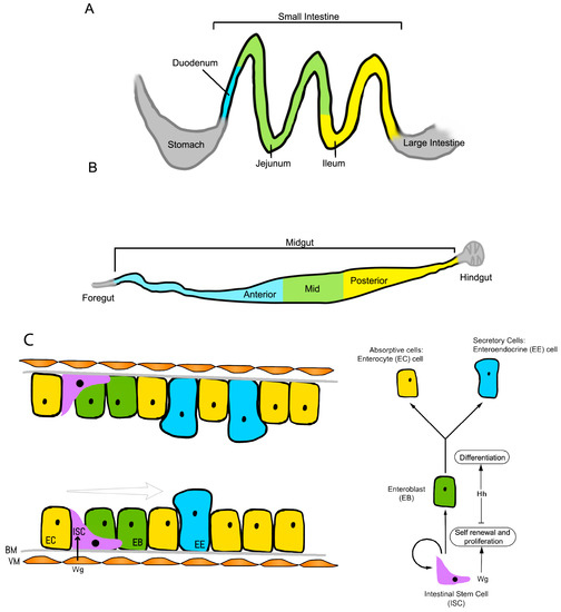 Schematic of the (A) mouse and (B) Drosophila intestinal systems; (C) Development of intestinal stem cells in the Drosophila hindgut. Wg/Wnt1 secretion from the visceral muscle (VM) promotes intestinal stem cell (ISC) proliferation and self-renewal. As the cells divide and move away from the Wg signal, exposure to hedgehog (Hh) induces the onset of enteroblast (EB) differentiation. Notch signaling determines the cell fate, with strong notch signals in the EBs favoring differentiation into enterocytes (ECs). BM: basement membrane; EE: Enteroendocrine.
