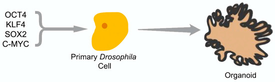 Experimental procedure: Transformation of primary Drosophila cells with the four stem-cell genes from humans: OCT4, KLF4, SOX2, and C-MYC. The cells are expected to develop induced pluripotent stem (iPS) cell-like characteristics in media containing 2 kinase inhibitors (2i media) and grow into an organoid once differentiation factors are applied or 2i media is removed.
