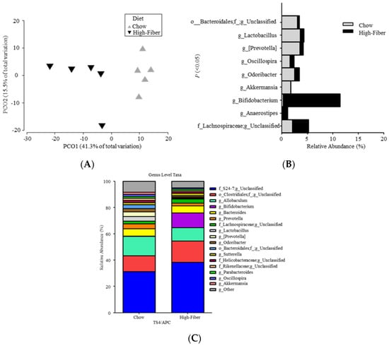 3.2. High Fiber Treatment Alters the Microbiota Composition in Polyposis Mice