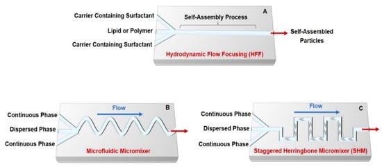 Some platforms suitable for preparing self-assembled particulate drug delivery systems include hydrodynamic flow focusing (HFF), microfluidic mixer in conjunction with staggered Herringbone micromixer (SHM), or microfluidic mixer in conjunction with SHM. Self-assembled carriers are commonly generated through HFF by controlling the mixing rates between fluid streams based on the microchannel shapes, flow rates, and diffusion coefficients of different miscible streams (Figure 1A). Setting the flow rate ratios (FRR) of water and a solvent containing polymers or lipids precisely enhances the self-assembly reaction and controls the degree of mixing within the microfluidic channel [17,18,20,21,22,23,24,25,26,27]. Increasing the ratio of the flow rate of solvent to that of water induces the slow mixing and generation of large nanoparticles.