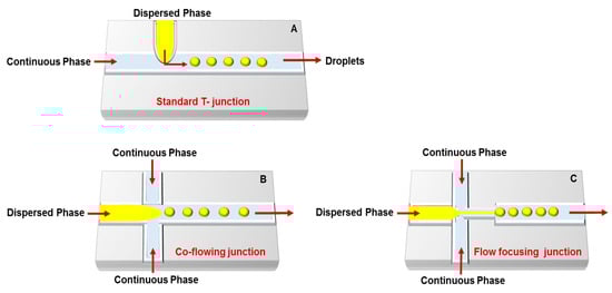 Droplets microfluidic platforms for generation of drug and gene carriers: (A) T-junction; (B) co-flowing junction; and (C) flow-focusing junction. Dispersed phase consists of divided droplets that suspended in the continuous phase Figure modified from References [44,45].