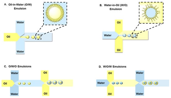 Schematic illustration of microfluidic platforms used to fabricate single (A) oil in water (O/W) and (B) water in oil (W/O) emulsions or double (C) oil in water in oil (O/W/O) and (D) water in oil in water (W/O/W) emulsions.