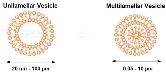 Liposomes: Liposomes are amphiphilic lipid vesicles that are considered one of the most successful candidates for drug delivery due to their lipid arrangement, which mimics the biological cell membrane. Their size and dimensions can vary from tens of nanometers to several hundred micrometers, and they can be composed of a single closed shell or more (unilamellar or multilamellar vesicles, respectively) (Figure 4). Liposomes are formed spontaneously in aqueous media into spherical bilayers with an aqueous interior core surrounded by a hydrophobic lipid bilayer membrane [102,103]. Hence, liposomes can be loaded with hydrophilic or hydrophobic molecules. Hydrophilic agents can be entrapped in the interior core, while hydrophobic agents can be solubilized or inserted into the lipid membrane. Membrane proteins can also reconstitute into the liposome membrane to retain their activity. There are several techniques to generate liposomes, including lipid film hydration, sonication, extrusion, reverse-phase evaporation, and high-pressure homogenization. Preparation methods can influence liposome size, lamellarity, and encapsulation efficiency. Recently, the development of microfluidic devices helps in the generation of monodispersed liposomes by decreasing the time and the number of steps [104]. The droplet-based microfluidic system is one of the most common microfluidic approaches employed in liposome production [50]. This strategy is based on manipulation of two immiscible phases that generate micrometer- to sub-micrometer-sized droplets (usually W/O emulsions). The nanoparticles (i.e., liposomes) then form in the droplets. Martz et al., [105] designed a flow-focusing device with a pressure-controlled system to generate lipid vesicles with a diameter less than 100 nm. By controlling the pressure and the flow rates of the continuous and dispersed phases, micro- and nano-droplets were produced for acoustic droplet vaporization applications. Davies et al., [106] reported the development of a 3D flow-focusing microfluidic device modified with coronal discharge. In this system, after solvent extraction and, by controlling the capillary numbers of immiscible flows, the generated double emulsion can be transformed into liposomes.