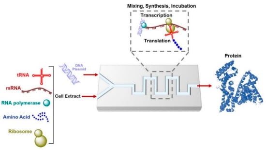 The production of therapeutic proteins by genetic engineering is attracting more attention with the rapid developments in biotechnology. Natural or genetically modified proteins can be used as active substances for therapeutic uses. Several pharmaceutical proteins are difficult to express or are toxic to living cells. As a promising alternative to cell-based protein synthesis, pharmacologically relevant proteins can be synthesized efficiently with cell-free systems. Cell-free protein synthesis (CFPS) is simple, fast, reduces the required sample/reagent volume, controls and adjusts the reaction conditions easily, and removes the need for cell transformation or culturing, thereby accelerating the screening of large protein libraries (Figure 6). Integration of CFPS in a microfluidic device has many advantages, including achieving high-throughput protein expression, stimulating the expression of multiple proteins, reducing reagent consumption (which reduces the cost of protein synthesis), enabling the production of a single-dose of therapeutic proteins, allowing rapid protein detection and analysis, and eliminating the requirement to harvest proteins [130,131,132,133,134]. Mei et al., [135] reported the fabrication of a microfluidic array device for continuous exchange. This device comprises a tray and a wall chamber separated by a dialysis membrane for CFPS and a nutrient reservoir. The green fluorescent proteins chloramphenicol acetyl-transferase and luciferase were synthesized in this microfluidic device. Although the protein production is 5–10 times longer than the production in a micro tube, the production yield was 13–22 times higher. In another study, a microfluidic 96-well plate with continuous cell-free protein expression components had a production yield up to 87 times higher than a traditional batch system [136].