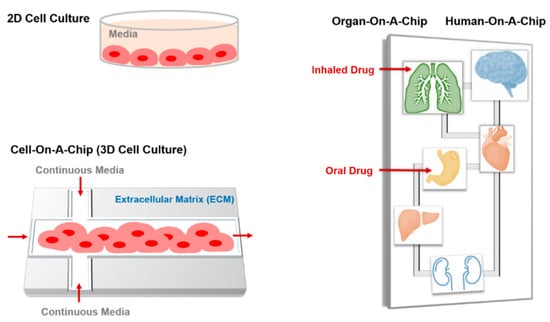 Schematic drawing of 2D cell culture, cell-, organ-, and human-on-a-chip.