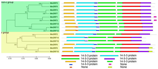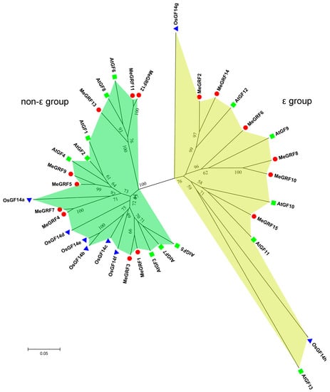 A phylogenetic tree was constructed to understand the evolutionary relationships among GRF proteins from cassava, rice, and Arabidopsis (Figure 1; Table S3). The results suggested that all the GRFs were clustered into the ε group and the non-ε group. The ε group included MeGRF-2, -6, -8, -10, -14, -15, AtGF-9, -10, -11, 12, -13, and OsGF14-g, -h. The non-ε group contained MeGRF-1, -3, -4, -5, -7, -9, -11, -12, -13, AtGF-1, -2, -3, -4, -5, -6, -7, -8, and OsGF14-a, -b, -c, -d, -e, -f. Generally, GRFs from cassava showed closer relationship with GRFs from Arabidopsis than those from rice, which is consistent with the current understanding of plant evolutionary relationship.