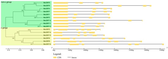 Exon-intron structure analyses of cassava GRFs. Gene structure display server (GSDS) database was used to analyze the exon-intron structures of MeGRFs. The yellow boxes represent exons and the black lines are introns [].