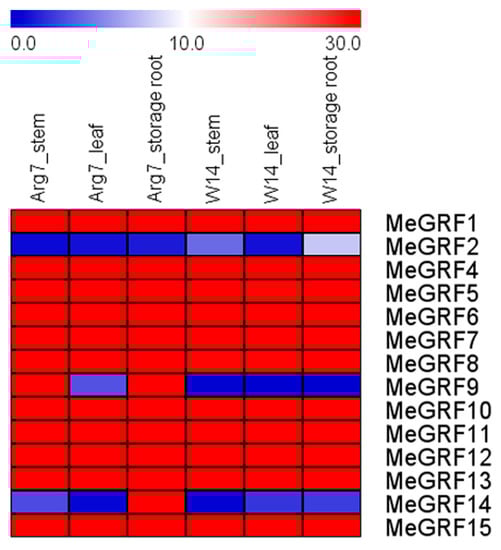 Expression analysis of cassava GRFs in stems, leaves, and storage roots of W14 and Arg7. The heat-map was created according to the Fragments per kilobase of transcript per million fragments mapped (FPKM) value of MeGRFs. Changes in gene expression are shown in color as the scale.