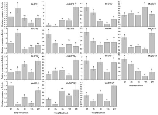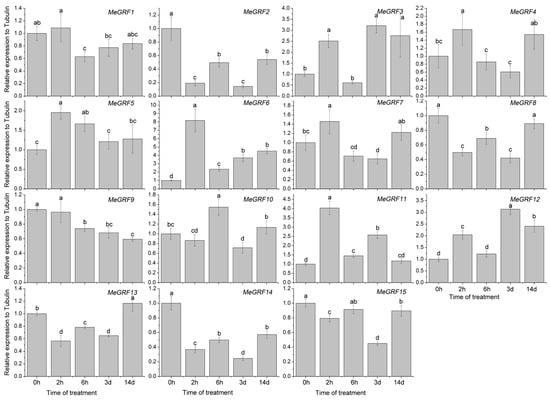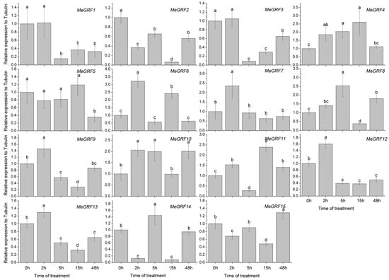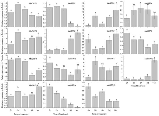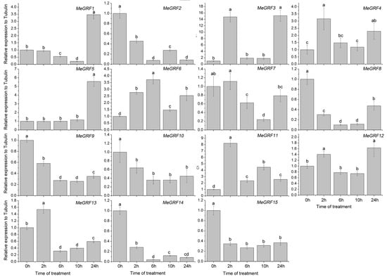 To investigate the transcriptional responses of MeGRF genes to abiotic stress and related signaling, cassava seedlings were subjected to cold, osmotic, salt, ABA, and H2O2 treatments (Figure 5, Figure 6, Figure 7, Figure 8 and Figure 9). Under cold treatment, MeGRF-4, -6, -7, and -10 showed induction, whereas MeGRF-1, -2, -3, and -5 showed repression. Under salt treatment, MeGRF-3, -4, -5, -6, -11, -12, and -13 were upregulated, while MeGRF-2, -8, -9, -10, -14, and -15 were downregulated. Under osmotic treatment, MeGRF-3, -5, -6, -10, -11, and -12 showed upregulation, whereas MeGRF-1, -2, -8, -9, -14, and -15 showed downregulation. Under ABA treatment, MeGRF-3, -4, -5, -6, -11, and -12 transcripts increased, whereas the transcripts of MeGRF-2, -7, -8, -9, -10, -14, and -15 decreased. Under H2O2 treatment, MeGRF-2, -4, -9, and -10 were induced, whereas MeGRF-3, -6, -7, -11, -12, and -13 were repressed. These results indicated that most of the MeGRF genes showed transcriptional changes under abiotic stress and related signaling molecule treatments.