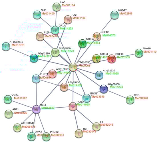 Interaction network analyses of GRFs in Arabidopsis and cassava. The upper one in the nodes represent genes in Arabidopsis. The lower one in the nodes represent genes in cassava. The genes marked with green font show GRFs; the genes marked with red font show the interactors of GRFs.