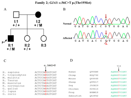 In Family 2, Sanger sequencing of the proband revealed a previously described mutation in the GJA3 gene c.56C>T p.(Thr19Met), segregating in our family with the disease phenotype in an AD manner (Figure 2A, B). This particular variant was located in the connexin domain of the protein and was predicted to be disease causing, deleterious, damaging by MutationTaster, SIFT, and Polyphen-2, respectively, with a PhyloP score of 6.18 (indicates nucleotide conservation) (Figure 2C) and Grantham score of 81, as threonine is a highly conserved amino acid among different species (Figure 2D).