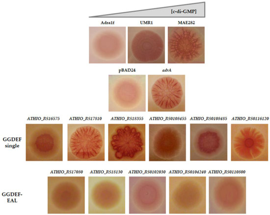 Heterologous complementation in Salmonella enterica serovar Typhimurium strain AdrA1f of diguanylate cyclase activity from single GGDEF and GGDEF/EAL encoding genes of Acidithiobacillus thiooxidansT. The rdar (rough, dry and red) morphotype [57], which is induced by diguanylate cyclase (DGC) activity was analyzed on congo red agar plates and compared to wild type (UMR1), DGC null-mutant (AdrA1f), DGC complemented (padrA), negative control (pBAD24 without insert) and a phosphodiesterase null-mutant (MAE 282) strains.