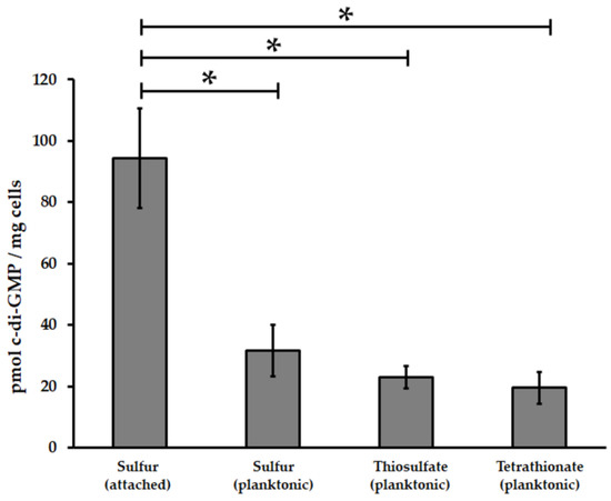 Comparative analysis of c-di-GMP levels from biofilm and planktonic At. thiooxidansT cells grown in different energetic substrates. The nucleotide-enriched extracts were analyzed by high-performance liquid chromatography (HPLC) coupled to photodiode array detector. Values represent the average of tree independent experiments ± standard deviation. Significant differences made by a one-way analysis of variance (ANOVA) test (p < 0.05) are noted (*).