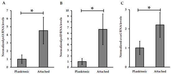 At. thiooxidansT cells were grown in 200 mL of medium with sulfur, thiosulfate or tetrathionate for five days. Planktonic cells were collected by centrifugation at 6000× g for 10 min. Biofilm cells were separated from solid sulfur by incubation with 0.05% Triton X-100 and collected by centrifugation [24]. Total RNA was extracted from both cell sub-populations as previously described, incubated with DNase I at 37 °C for 1 h and purified by phenol-chloroform treatment [24]. The complementary DNA (cDNA) was synthetized from 1 µg of total RNA by using reverse transcriptase and random primers. Then, cDNA was diluted 1/30 with nuclease-free water and used as template for qPCR experiments. Specific primers were designed to analyze transcriptional levels of the pelA, pelD and wcaG genes. 16S rDNA and map were used as housekeeping genes for data normalization [52].