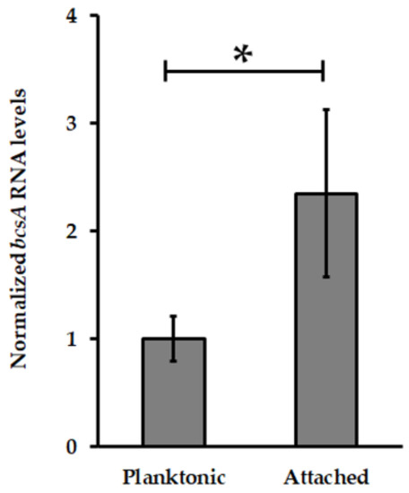 Transcription levels analysis of BcsA (cellulose synthase catalytic subunit) encoding gene from At. thiooxidansT. Transcript levels of bcsA were measured by qPCR and then normalized using DNA 16S and map genes. Values represent the average of four independent experiments ± standard deviation. Significant differences made by a one-way ANOVA test (p < 0.05) are noted (*).