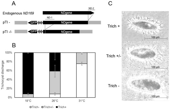 Paramecium tetraurelia strain 51 was cultivated in wheat grass powder medium (WGP, Pines International Co., Lawrence, KS, USA) supplemented with 0.8 g/mL -sitosterol and inoculated with Klebsiella pneumoniae. Transformation of single cells was performed by using microinjection as described before [15]. The pTI- and pTI-/- constructs were described in [17]. Successfully transfected cells were validated by GFP expression and cultivated at 4 C to build up a stock and prevent autogamy. Cells of a transgenic line were split and slowly adapted to the indicated experimental temperature (18 C, 26 C, 31 C). The efficiency of the ND169 gene silencing triggered by the transfected construct was observed by trichocyst discharge using picric acid.