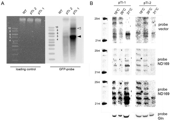 Analysis of temperature dependent siRNAs in low and high copy number injected transgenic lines. (A) Southern blot of macronuclear DNA isolated from WT and two pTI- lines (pTI-1, pTI-2) hybridized with a GFP specific probe (right). The ethidium bromide stained gel before blotting is shown on the left. The black arrowhead points to transgene mini-chromosomes in the size of the linearized plasmid of approx. 4475 bp with additional telomers. The open arrowhead points to transgene dimers resulting from endogenous end repair. Size of the ladder bands are displayed in kb; (B) Northern blot of siRNAs of the two transgene lines cultivated at the indicated temperatures. The marker is shown on the left (5’-OH), a probe against the glutamin tRNA serves as a loading control. The upper panel shows hybridizations with a vector specific probe, downstream of the truncated ND169 gene region. Below, hybridizations with a ND169 specific probe are shown with low exposure and beneath with longer exposure.