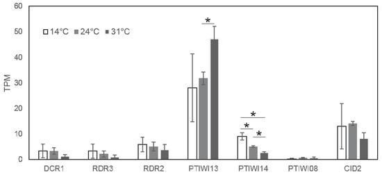 Expression levels of known RNAi components involved in transgene-induced silencing at different temperatures (14 C, 24 C or 31 C). Data is shown in average and standard deviation of three biological replicate TPM values [19]. Significant differences are denoted by * (p value < 0.05, Student’s t-test).