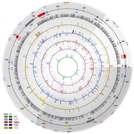 Schematic map of protein expression in different conditions along the Methanonatronarchaeum thermophilum AMET1 genomic contigs. The grey transparent sectors show M. thermophilum AMET1 genomic contigs as follows: AMET1_2–light grey, AMET1_3–medium grey, AMET1_4–dark dray (minor contigs are not shown). Dark grey circle shows base (optimal) conditions relative protein abundance level. The inner cycles represent up- and down regulated genes in different experimental conditions according to the colour code shown on the left bottom corner of the Figure. Genes and genes clusters described in the paper shown by shapes and lines as follows: Red—the most abundant genes; Red—RSO1,2,3—three ribosomal; Blue—methanogenesis related genes; Blue—methanogenesis operons: MTT-trimethylamine-corrinoid methyltransferase, MTB-dimethylamine-corrinoid methyltransferase superoperons; MTM-methylamine-corrinoid methyltransferase, MTA-methanol-corrinoid methyltransferase; MCR-methyl coenzyme M reductase; Yellow—chemotaxis operon (CHE) and archaellum (FLA). Black—mobile elements: His2—His2 virus related loci, PLA-putative plasmid, IE1 and IE2—integrated elements.