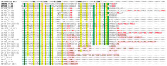 M. thermophilum AMET1 proteins were assigned to most recent archaeal Clusters of Orthologous Groups, arCOGs in the course of the previous work [3]. The PSI-BLAST program was used to search protein sequences against non-redundant database at NCBI (National Center for Biotechnology Information) [15]. Protein sequences for selected families were aligned using MUSCLE [16]. Protein secondary structure was predicted using Jpred 4.0 [17]. Transmembrane helices in proteins were predicted using TMHMM 2.0 [18].