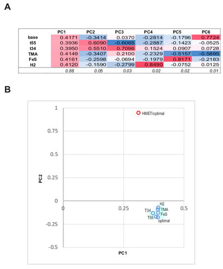 In order to determine the impact of different growth conditions (optimal, sub- and supraoptimal temperature, trimethylamin as an electron acceptor, FeS as growth factor, H2 as electron donor) on the abundance of 1157 unique quality-filtered proteins obtained from the 6 sample groups, we applied PCA to the proteomic data (Figure 3A). The first Principal Component (PC1) encompasses high positive contributions of abundances from all experimental conditions and these contributions are comparable in magnitude (Figure 3A). PC1 captures most of the original data variance, 88%. This indicates that, overall, the abundances in all experimental conditions are strongly and positively correlated and that the condition-independent component of the abundance is the dominant trend in the data. PC2 and PC3 are largely composed of the contributions of the two suboptimal growth temperature conditions; these contributions have the same signs in PC2 and opposite signs in PC3, together accounting for further 7.5% of the data variance. The remaining components are largely composed of individual contributions from experiments with changed trophic conditions that exert uncorrelated effects on the structure of the data space.