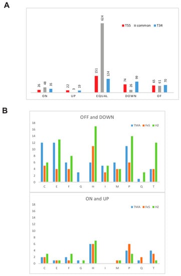 Protein abundance changes in response to non-optimal conditions. (A) Comparison of response to supra- and suboptimal temperature conditions. The bars show the number of proteins. (B) Comparison of the response to different growth factors for different functional categories. The bars show the number of proteins. Upper panel show upregulated proteins and bottom panel show downregulated proteins. Functional categories are by one letter code as follows: E—Amino acid metabolism; F—nucleotide metabolism; G—Carbohydrate metabolism; H—Coenzyme metabolism; I —Lipid metabolism, M—Cell wall/membrane/envelop biogenesis; P—Inorganic ion transport and metabolism; Q—secondary metabolism.