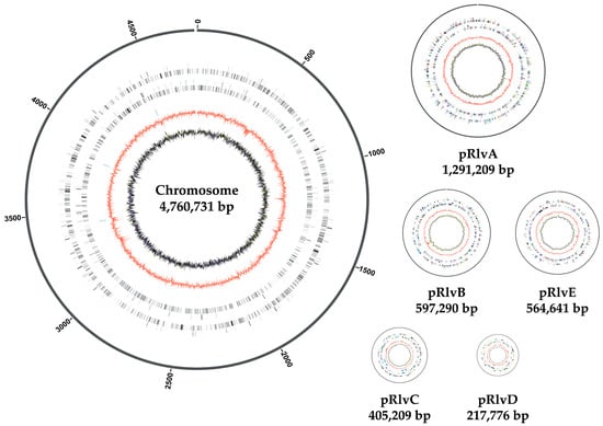 Rlv UPM791 extrachromosomal replicons have been named pRlvA, pRlvB, pRlvC, pRlvD, and pRlvE. All five plasmids have putative replication systems based on repABC genes. The largest extrachromosomal replicon is chromid pRlvA (1,291,920 bp and 1246 CDSs). Plasmids pRlvB and pRlvE have similar sizes, with respective values of 597,290 bp and 564,641 bp (588 and 545 CDSs, respectively). These two plasmids were previously visualized as a unique, more intense band in Eckhardt gels []. The two smallest plasmids are pRlvC (symbiotic plasmid, 405,209 bp and 366 CDSs) and pRlvD (217,776 bp, 239 CDSs).