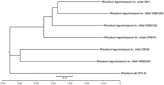 - Reeve, W.; O’Hara, G.; Chain, P.; Ardley, J.; Brau, L.; Nandesena, K.; Tiwari, R.; Malfatti, S.; Kiss, H.; Lapidus, A.; et al. Complete genome sequence of Rhizobium leguminosarum bv. trifolii strain WSM2304, an effective microsymbiont of the South American clover Trifolium polymorphum. Stand. Genom. Sci. 2010, 2, 66–76. [Google Scholar] [CrossRef] [PubMed]