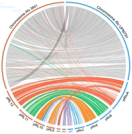 When the plasmid content was compared to that of Rlv 3841 (Figure 4, see Supplementary Figure S4 for more detail), we observed that four out of the five Rlv UPM791 plasmids had an equivalent in Rlv 3841 []. Plasmid pRlvA combines sequences from three different origins: (a) pRL12, the Rlv 3841 chromid []; (b) pRL8, a pea rhizosphere-specific plasmid with little collinearity (<5%) with other sequenced rhizobial genomes []; and (c) sequences not present in the Rlv 3841 genome, namely regions 342–426 kb (84 kb), 567–700 kb (133 kb), and 717–802 kb (85 kb). One of the noteworthy differences found between pRlvA and pRL12 is the absence of the Type VI Secretion System (T6SS), a system that is altogether missing in the Rlv UPM791 genome. With a GC content of 59.7%, pRlvA appears close to the chromosome (GC content of 61%), and would represent a megaplasmid or chromid, not uncommon in proteobacteria [,]. As such, pRlvA harbours some relevant genes, such as ATP-binding cassette (ABC) transporters (like the urea transport system UrtABCDE, RLV_0741 to RLV_0745), MCPs, or genes related to organic acids and sugar metabolism.