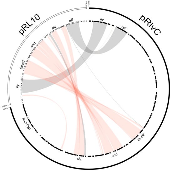 Surprisingly, while plasmids pRlvA, pRlvB, pRlvD, and pRlvE showed relatively good conservation with counterparts in Rlv 3841, symbiotic plasmid pRlvC exhibited a low degree of conservation with its Rlv 3841 counterpart, pRL10 (488,135 bp). This led us to analyse it in depth in the next section.