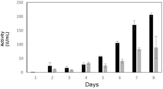 Extracellular lipolytic activity measured with p-nitrophenol palmitate. Black bars show the activity in the strain B13-1; gray bars show the activity in the strain B13-3. The data show the standard deviation of three independent samples.