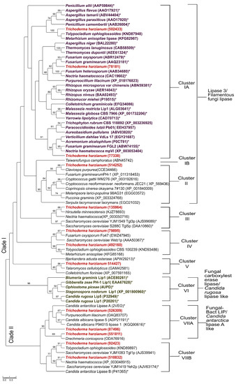 T. harzianum 514252 grouped in the cluster II with lipases from C. purpurea and F. graminearum, in a sister clade to lipases from Basidiomycetes (Cryptococcus gatti, Cryptococcus neoformans, Coprinus cinereus, Melampsora larici-populina and Puccinia graminis); however functional information regarding these lipases has not been elucidated.