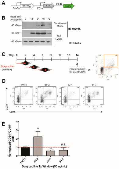 We previously identified Wnt9a to be specifically required during zebrafish HSC development [36]. To determine to what extent the requirement for this Wnt protein is conserved during human hematopoietic development, we generated an hESC cell line (H9) carrying a WNT9A transgene under the control of a doxycycline-inducible promoter, and a constitutive promoter driving Citrine expression to monitor silencing of the transgene (Figure 2A). WNT9A secretion peaked at 48 h after doxycycline treatment, and WNT9A persisted in the media for at least 24 h after doxycycline removal (Figure 2B). Upon expression of WNT9A during various time windows of differentiation, we determined that induction of WNT9A from days 0–2 (i.e., WNT9A treatment from days 1–3) resulted in an increase in CD34+/CD45+ hematopoietic progenitors, while other induction timepoints did not (Figure 2C–E). This is in line with treatment with activation of the Wnt pathway with CHIR from days 2–4, and previous studies indicating that the critical window for Wnt activation during in vitro hematopoietic progenitor differentiation is after the formation of mesoderm from approximately days 2–3 [41,43]. These data demonstrate that WNT9A impacts human hematopoietic progenitor development in a temporally-regulated manner.