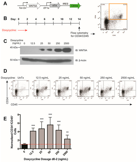 WNT9A has a dose-dependent effect on hematopoietic differentiation efficiency. (A) Schematic of doxycycline-inducible WNT9A transgene. (B) Schematic of doxycycline induction of WNT9A expression and flow cytometry readout for the data shown in (D,E). (C) Immunoblot (IB) showing increasing WNT9A protein expression in response to the dosages of doxycycline shown. Top: WNT9A, Bottom: β-ACTIN loading control. (D) Representative flow cytometry plots for data graphed in (E); (E) Percentage of CD34+/CD45+ cells normalized to untreated control. Data represent the average of three biological replicates. ** = p value < 0.01, *** = p value < 0.001, n.s. = Not significant. Error bars represent standard deviation.