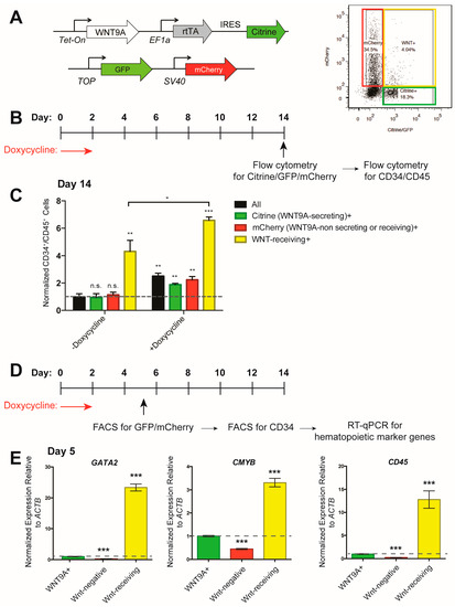 In the zebrafish embryo, WNT9A is secreted by the somites and received by the developing hemogenic endothelium in a paracrine manner [36]. To model this, we used the inducible WNT9A hESC line shown in Figure 2 and Figure 3 (constitutively labeled with Citrine), and co-cultured these cells with an hESC line harboring a TOP:GFP;SV40:mCherry transgene (constitutively labeled with mCherry) (Figure 4A). This cell line will express GFP after receiving a β-catenin-mediated Wnt cue, and can be distinguished from the WNT9A producing cells by mCherry expression, allowing for analysis of (1) all cells (black bars); (2) WNT9A-secreting cells (Citrine+, green bars); (3) non-WNT9A-secreting, non-Wnt-receiving cells (mCherry+, red bars); (4) Wnt-receiving cells (GFP+/mCherry+, yellow bars) (Figure 4A–C). When WNT9A was expressed, differentiation efficiency was increased in all cell populations (Figure 4C). By analyzing hematopoietic markers in sorted CD34+ endothelial cells within each of the above populations, we found that Wnt-receiving cells were biased to differentiate to hematopoietic cells as early as day five of the differentiation, since Wnt-receiving endothelial cells are enriched for expression of the hematopoietic marker genes GATA2, CMYB, and CD45 (Figure 4D,E). Taken together, these data indicate that during in vitro hematopoietic differentiation, cells must receive a Wnt signal to efficiently differentiate to hematopoietic progenitors. Receiving a WNT9A signal increases this differentiation efficiency. Interestingly, Wnt-receiving cells that received a WNT9A signal differentiated more efficiently than cells that received endogenous Wnt cues. Altogether, this suggests that, like in the zebrafish, there is a requirement for specific Wnt ligands during in vitro differentiation of hematopoietic progenitors.