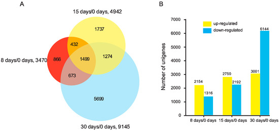 According to the criteria of at least two-fold change and FDR < 0.01, a total of 3470 DEGs were discovered by analyzing 8 days/0 days, with 2154 up-regulated and 1316 down-regulated; 4942 DEGs were identified in the comparison of 15 days/0 days, with 2750 up-regulated and 2192 down-regulated; 9145 DEGs were found by comparing 30 days/0 days, with 3001 up-regulated and 6144 down-regulated. In total, 12,180 DEGs were identified during the grafting process, among which, 1499 genes were detected at all comparisons (Figure 1, Table S3). The number of DEGs in 30 days/0 days was greater than 8 days/0 days and 15 days/0 days, indicating the involvement of complex molecular responses during the developmental stage of vascular tissue formation.