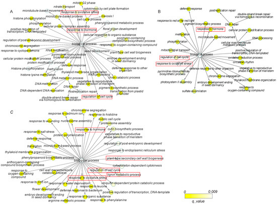 To elucidate the associated biological processes in which the DEGs were involved, the enrichment of GO terms was analyzed. For the ontology of biological process, there were 44, 28, and 38 GO enriched terms in the comparisons of 8 days/0 days, 15 days/0 days, and 30 days/0 days, respectively (Table S4, Figure 2). We found that “response to hormone”, “response to oxidative stress”, and “regulation of cell cycle” were simultaneously enriched in all the comparisons, suggesting the critical roles of these biological processes for a successful grafting. Interestingly, GO terms related to “plant-type secondary cell wall biogenesis” and “lignin metabolic process” were specially enriched in the 30 days vs. 0 days comparison, which were in good agreement with the developmental stage of vasculature formation at 30 days.