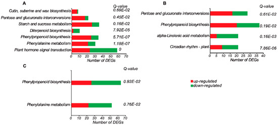 Additionally, KEGG enrichment analysis was performed to reveal the relevant metabolic pathways in which the DEGs participated. We identified 7, 5, and 2 significantly enriched pathways in 8 days/0 days, 15 days/0 days, and 30 days/0 days comparisons, respectively (Figure 3). Among those, the “phenylpropanoid biosynthesis” was the overlapping pathway that was identified in three comparisons, which was consistent with the significant role of this metabolic pathway during the grafting process [10,13].