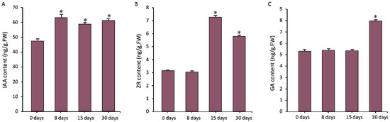 Determination of the contents of hormone at the graft unions during the pecan grafting process. (A) Indole acetic acid (IAA); (B) zeatin riboside (ZR); and (C) gibberellic acid (GA) at different timepoints. * indicates the significant differences (p < 0.05) between the specific timepoints and the basal level (0 days).