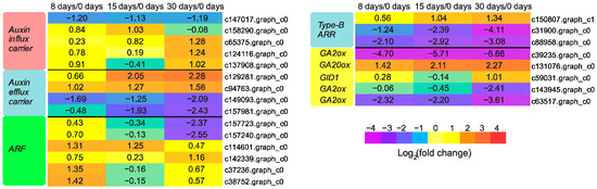 Expression patterns of DEGs involved in hormone signaling. The values of log2 fold change are shown in the heat map.