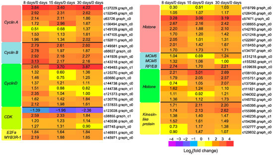 In addition, we found one E2Fa gene, c146931.graph_c0, and one MYB3R-1 gene, c145971.graph_c0, were up-regulated significantly during the entire period of grafting (Figure 6). E2Fa is a transcription factor that drives the expression of genes required for the S-phase in cell cycle [35]. Transgenic Arabidopsis overexpressing E2FA could induce cell division in tissues already devoid of proliferation [38]. MYB3R-1 is an R1R2R3-type MYB transcription factor that aims at inducing genes required for the M-phase in cell cycle [39]. The up-regulated E2Fa along with MYB3R1 would probably facilitate cell cycle progression in this study. Besides the genes involved in cell cycle, we found that various genes responsible for nucleosome component synthesis (histone), DNA replication (DNA replication licensing factor MCM5 and MCM6), microtubule cytoskeleton organization (microtubule-associated protein RP/EB family and tubulin), and cytokinesis (kinesin-like protein) were generally up-regulated over the course of grafting (Figure 6), which might have participated in callus formation.