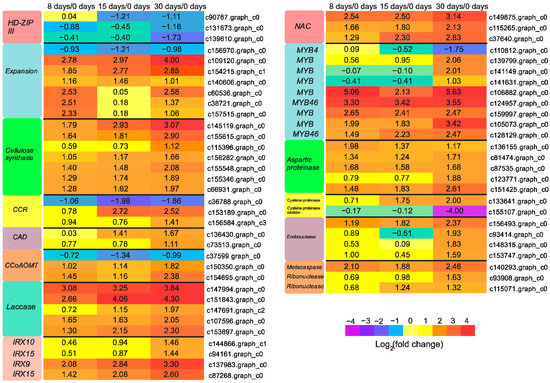 Expression profiles of DEGs involved in vascular bundle formation. Gene expression values were normalized to z-score. The values of log2 fold change are shown in the heat map.