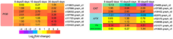 Expression profiles of DEGs involved in ROS scavenging. The values of log2 fold change are shown in the heat map.