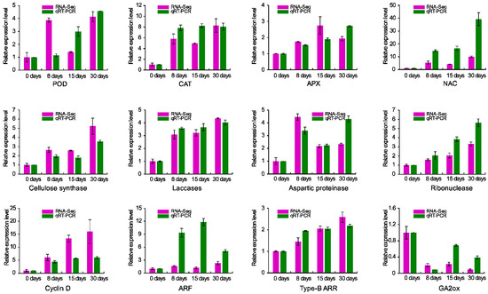 We selected twelve genes that were predicted to be associated with hormone signaling, cell division, secondary cell wall formation, programmed cell death, and ROS scavenging to validate the sequencing data. Gene expression at different time points was relative to basal level (0 days). For a specific treatment, the fold changes of some genes in their expression detected by qRT-PCR and sequencing did not match exactly, however, the expression patterns of those selected genes were basically identical between the two data sets (Figure 9).