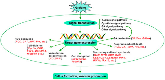 When grafting is performed, the grafted partners, scion, and rootstock are cut and joined together. Once the scion and rootstock come into intimate contact, an intricate structural and biochemical response occurs at the graft union for a successful graft. For woody trees, following the initial adhesion of grafted partners, the graft union undergoes two essential developmental processes: the formation of callus tissues, and the sufficient connection of functional vascular bundles between the scion and rootstock [2,3]. Therefore, graft union development is a process that involves cell division and differentiation at the graft junction.