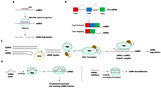 Gene regulation mechanisms mediated by antisense oligonucleotides (ASOs), triplex-forming oligonucleotides (TFOs), small interference RNAs (siRNAs) and microRNAs (miRNAs). (A) Antisense technology: RNAseH is able to recognize DNA:RNA hybrid complexes which leads to mRNA degradation and the blockade of protein synthesis. (B) RNA splicing mechanisms in order to restore the disrupted reading fragment of a gene by using ASOs targeting intron and exon junctions. (C) RNA interference: The siRNA duplex is unwound and the guide strand is recognized by Ago2. The resultant RISC complex is able to interact with complementary sequence of a target mRNA. (D) MiRNA technology: Gene expression can be modulated by using double or single-stranded miRNA mimics in order to restore the miRNA function by inhibiting translation process. MiRNA inhibitors with complementary sequences to miRNAs can also be used for inactivating ncRNAs.