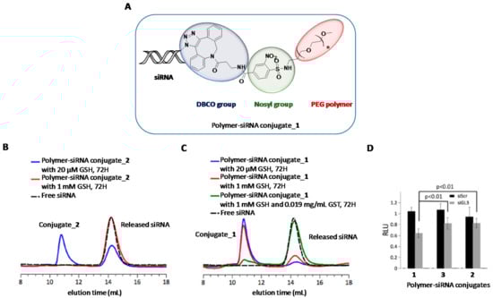 The presence of covalent bonds between nucleic acids and polymers as well as using polymer crosslinking strategies have resulted in the most used strategies for obtaining stable polymer-nucleic acid conjugates [87,88]. In this regard, “click” chemistry and the use of disulphide bonds have become the two well-known strategies that have been used for conjugating polymers directly to siRNA oligonucleotides. As opposed to polyplexes, the correct design of degradable spacers is crucial not only because it has to maintain some stability to resist extracellular milieu but also to be labile upon imparting cellular uptake and thus releasing the cargo. Recently, Huang et al. reported the nosyl group (2-nitrobenzenesulfonamide) as an appropriate linker for polymer-siRNA constructs [89] (Figure 3A). It exhibits resistance to acid and basic conditions and has the special feature of being cleaved by thiol moieties. To confirm this property, the aforementioned cleavable nosyl group was functionalized with a PEG polymer in the first place and secondly with dibenzocyclooctyne-amine (DBCO). This DBCO group has been widely exploited in bioconjugation reactions between alkynes and modified oligonucleotides containing azide groups [90]. Thus, this covalent strategy allowed the authors to prepare novel polymer-siRNA constructs (conjugate_1) with potential to respond under intracellular conditions. Additionally, the authors prepared a conventional disulphide linker covalently linked to a siRNA molecule (conjugate_2) for comparison purposes. The amount of siRNA release from conjugate_1 and _2 was investigated both in extracellular milieu (20 μM GSH, pH 7.4) and intracellular environments (1 mM GSH, +/− GST, pH 7.4) (Figure 3B,C). Interestingly, the authors confirmed the high stability of the nosyl group (conjugate_1) as practically inhibited the siRNA release (8%) under extracellular reductive conditions whereas the siRNA containing the disulphide group (conjugate_2) displayed a considerable siRNA release (38%) at the same experimental conditions. When GSH concentration was increased up to 1 mM, the integrity of conjugate_1 was scarcely affected (20% of siRNA release). Finally, total siRNA release was achieved when glutathione S-transferase was added to the GSH solution mimicking the conditions of intracellular environments. To further investigate the potential and stability of this polymer-siRNA construct, the authors carried out gene silencing studies by incubating three siRNA conjugates (one of them containing a non-hydrolysable linker, conjugate_3) in the presence of lipofectamine. The authors found significant inhibition activities for conjugate_1 which reduced luciferase expression up to 40% whereas gene knockdown efficiencies were halved in the other constructs (Figure 3D).