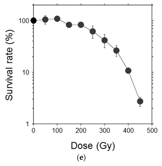 To elucidate the effects of ionizing radiation on the growth potential of P. patens protonemata, the protonemata were irradiated with γ-rays in the range of 100–500 Gy and suspension-cultured for one week (Figure 2a). After incubation, the protonemata were filtered on paper disks and the dry weight was measured (Figure 2b). Increase in dry weight, which is a measure of growth potential, of the protonemata for one week, decreased in a dose-dependent manner and the dose that decreased the potential by half was ~250 Gy (Figure 2c). Considering that the moss protonema is haploid and does not possess a duplicate set of chromosomes, the observed radiosensitivity was relatively low.